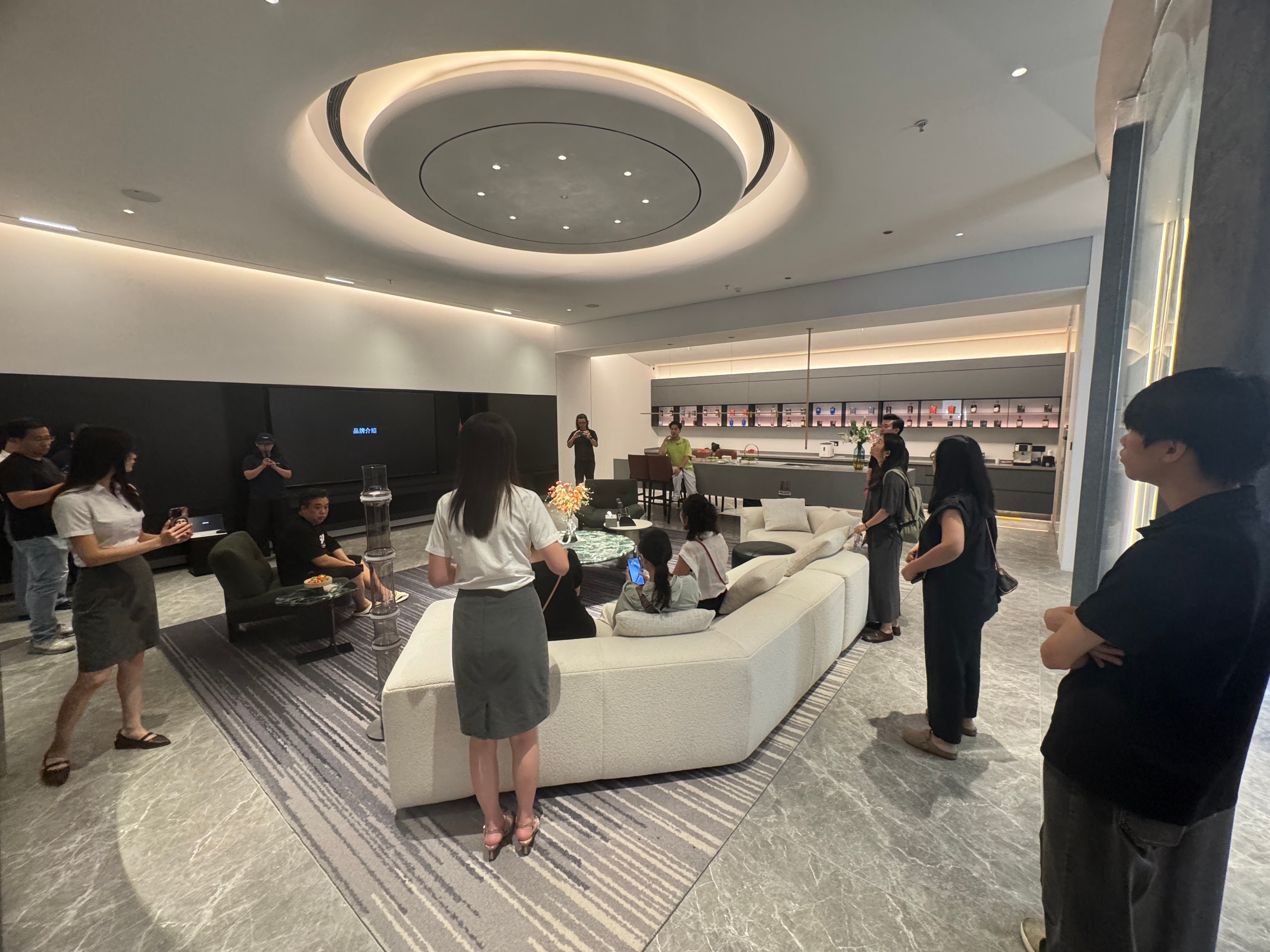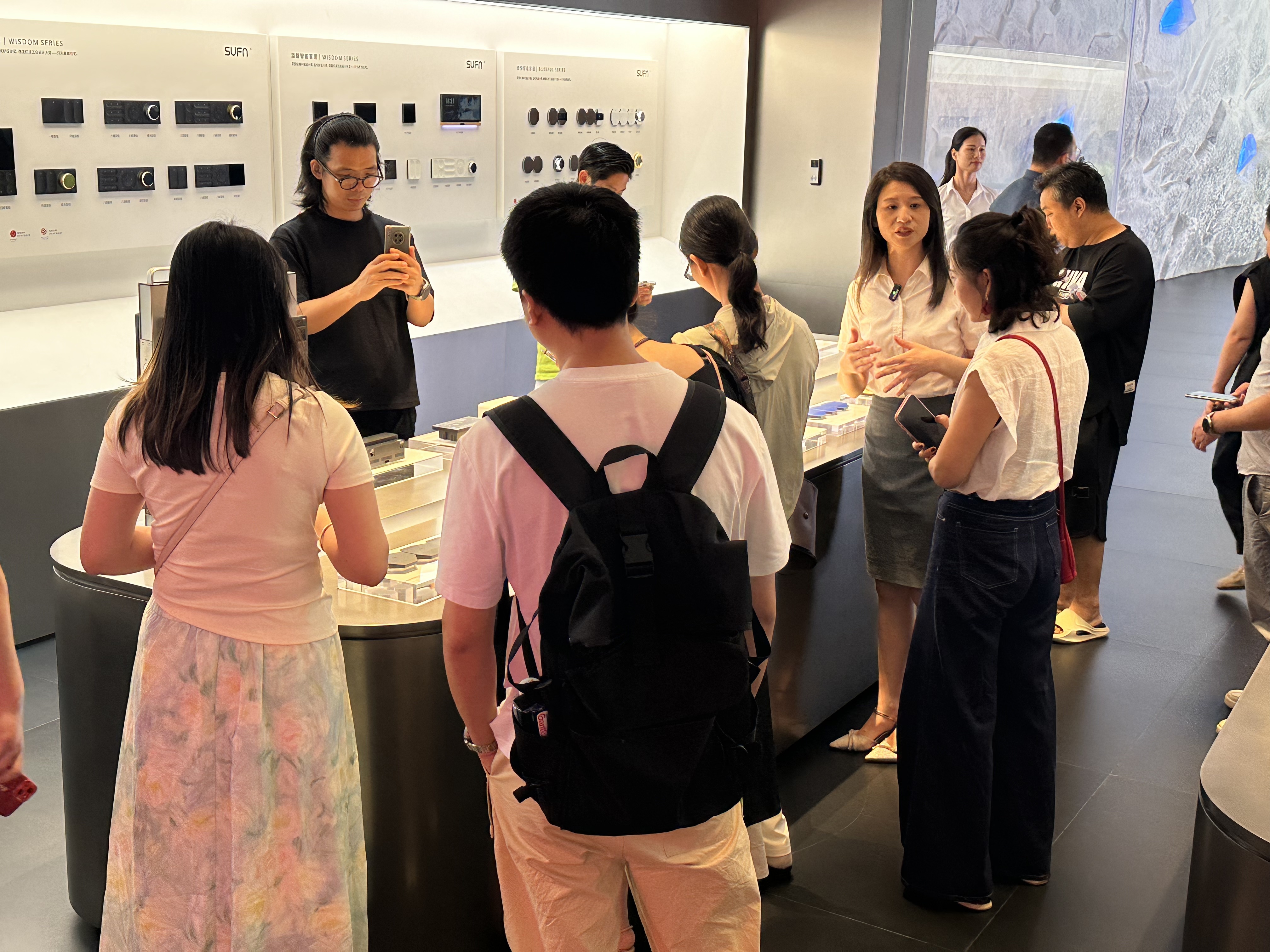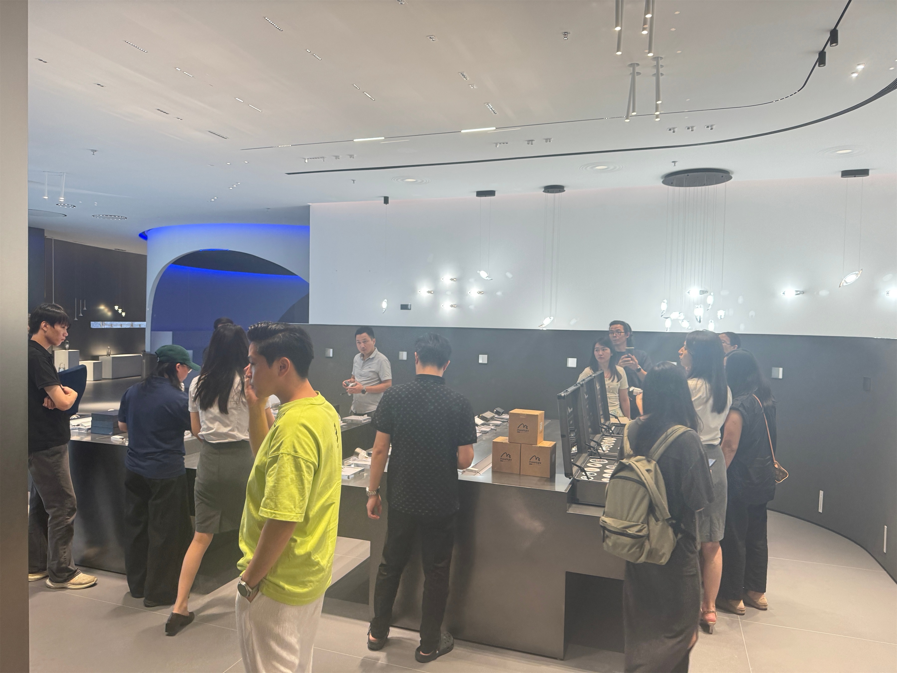 在参观过程中,设计师们先后走进磨影照明的光影体验展厅、智能控制展区、灯光产品展区,近距离感受品牌在照明技术研发与设计美学表达上的硬核实力。从自主研发的自适应调光系统到融合东方美学的定制化灯具系列,从精准还原自然光谱的健康照明方案到实现全场景智能联动的物联网控制系统,每一项创新成果都让设计师们驻足探讨。尤其在针对酒店民宿空间的光影解决方案时,磨影照明通过模拟不同房型的光影场景,直观呈现了 “光随空间气质而生” 的设计哲学,赢得了设计师们的一致好评。